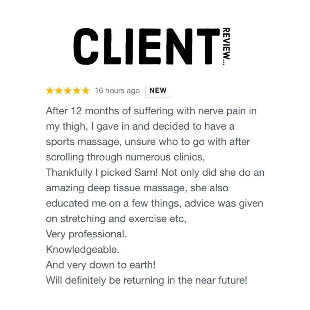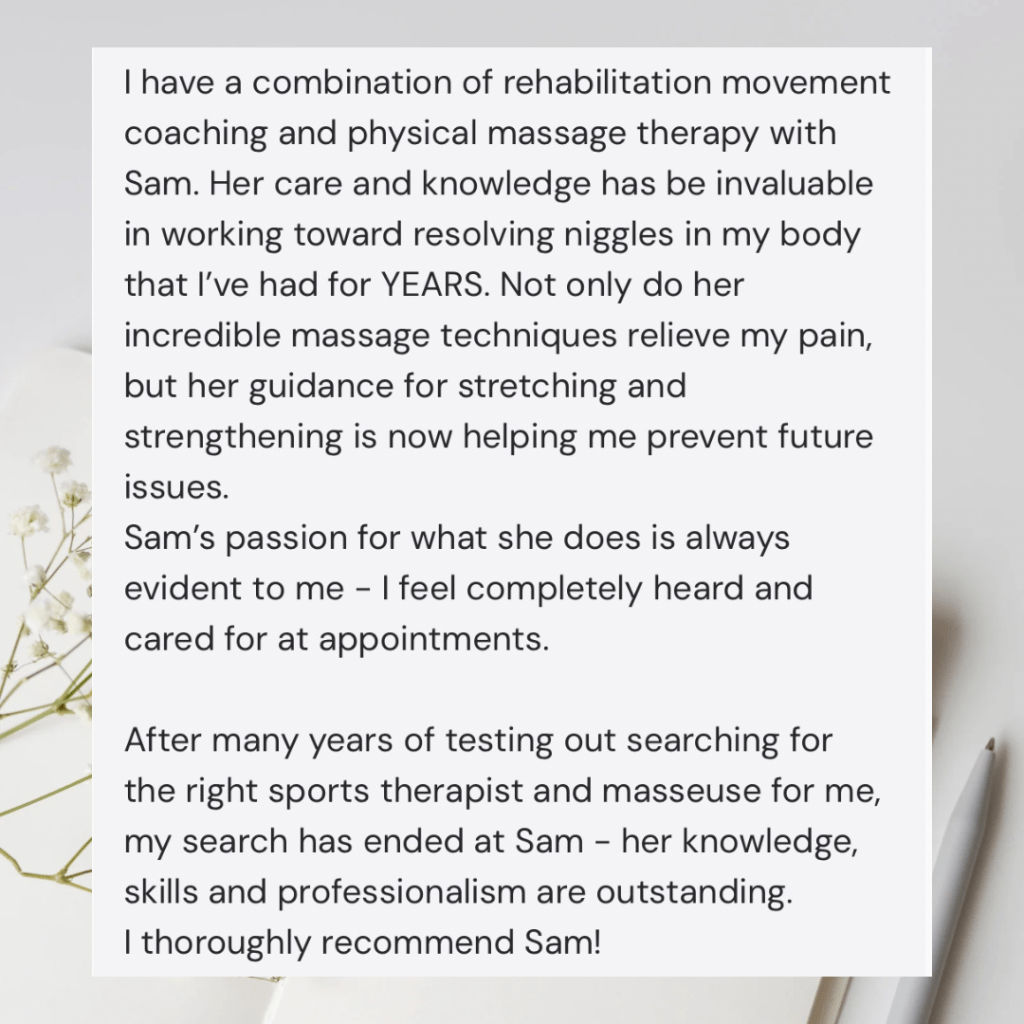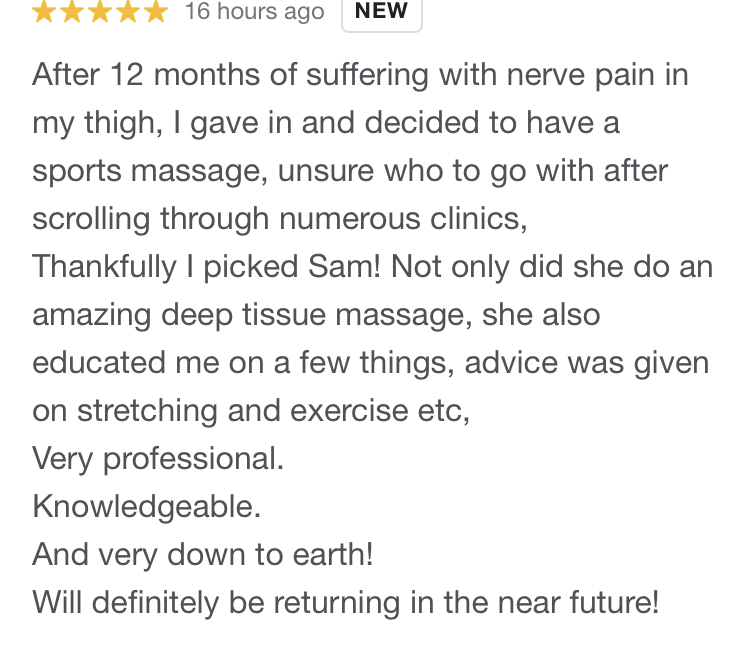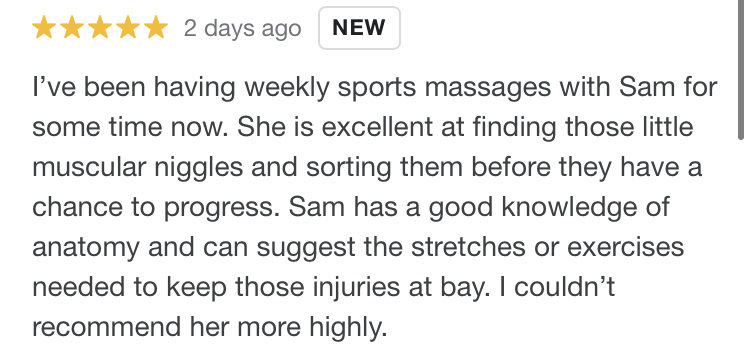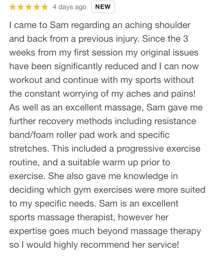 ”Sam is amazing and one of the best sports therapists I’ve ever had.